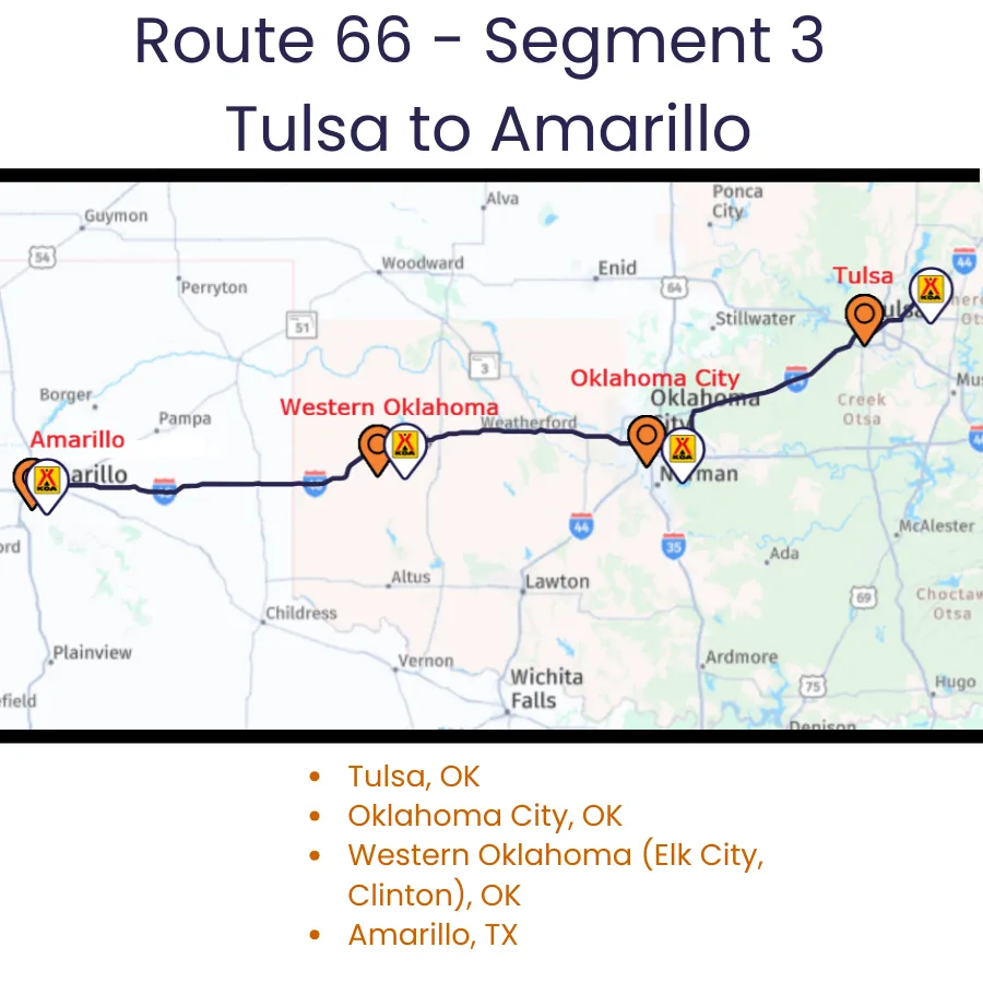 Section 3 carries Route 66 west from its birthplace in Tulsa through northeastern Oklahoma’s Green Country, across Oklahoma City’s multi‑alignment Route 66 corridors, and into the wide‑open landscapes of western Oklahoma and the Texas Panhandle. Expect beloved roadside mascots, legendary diners, art‑deco cities, neon‑lit drive‑ins, and classic plains scenery before arriving in Amarillo—home to some of the Mother Road’s most famous food and big‑sky landmarks.